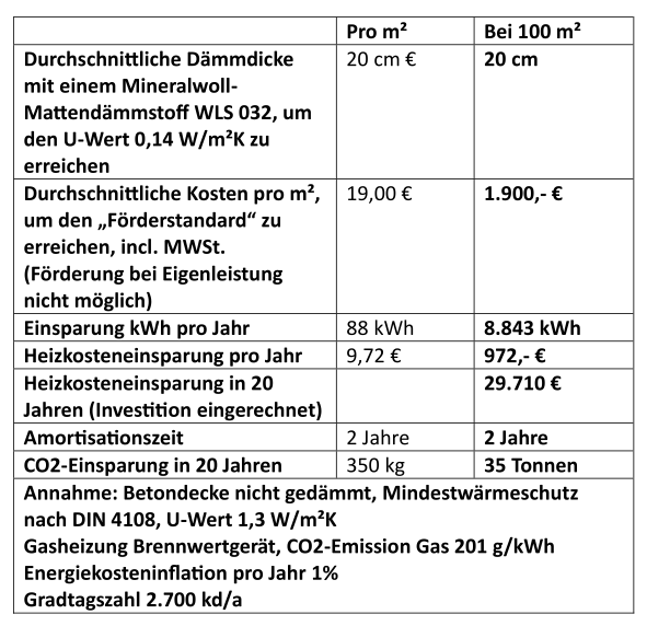 Kosten/Wirtschaftlichkeit: 20 cm Glaswollmatten kosten ca. 19,- €, empfohlen wird jedoch eine Dämmdicke von mindestens 30 cm. In diesem Fall liegen die Kosten bei 28,- € pro m². Die Maßnahme amortisiert sich in einem Zeitraum von unter 2 Jahren.